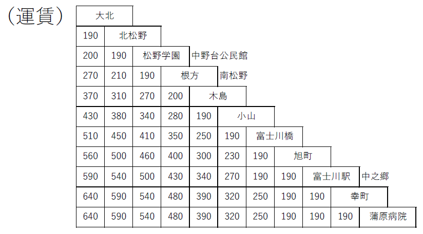 ➀小学生または障害者手帳所持者は半額(10円未満切り上げ)、小学生未満は無料